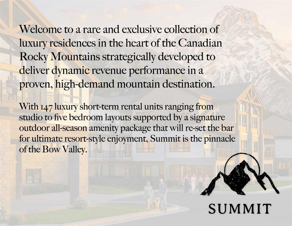 This well-designed 147-unit resort-style development is ideally located in the heart of the Bow Valley, surrounded by the Canadian Rockies and minutes from Canmore, Kananaskis, and Banff. The project features a strategic mix of short-term rental and tourist-zoned units, complemented by resort-style amenities including two outdoor hot tubs, outdoor heated year-round pool, multiple fire pit gathering areas, two cedar saunas, a fitness centre, and a shared workspace. Ground-floor commercial spaces provide ever...