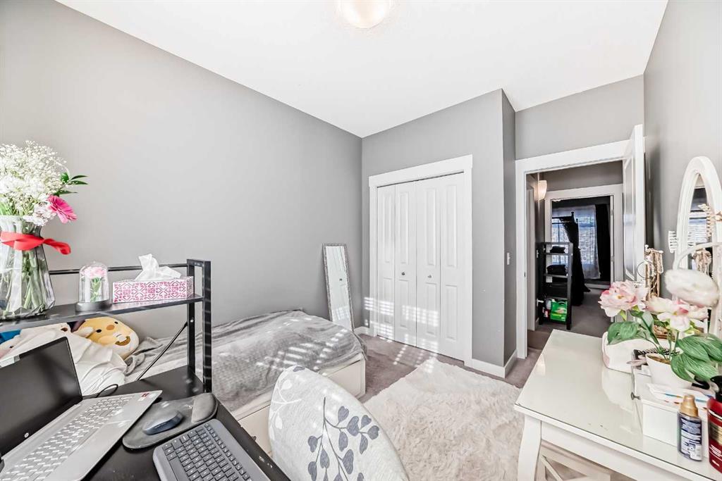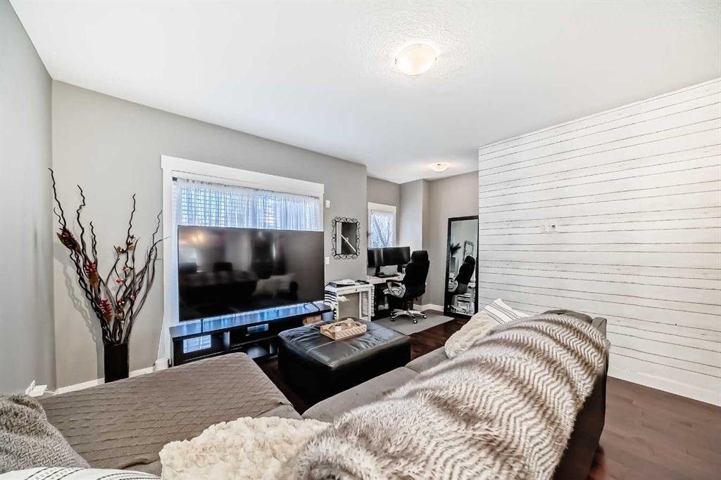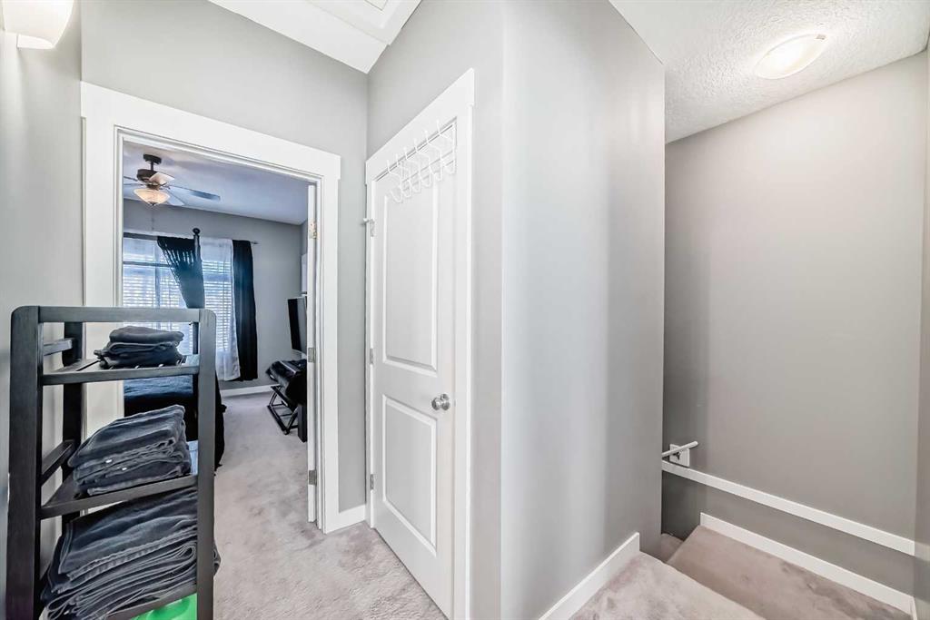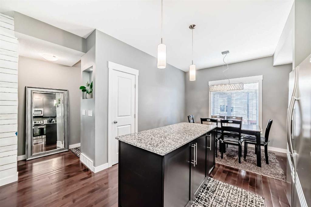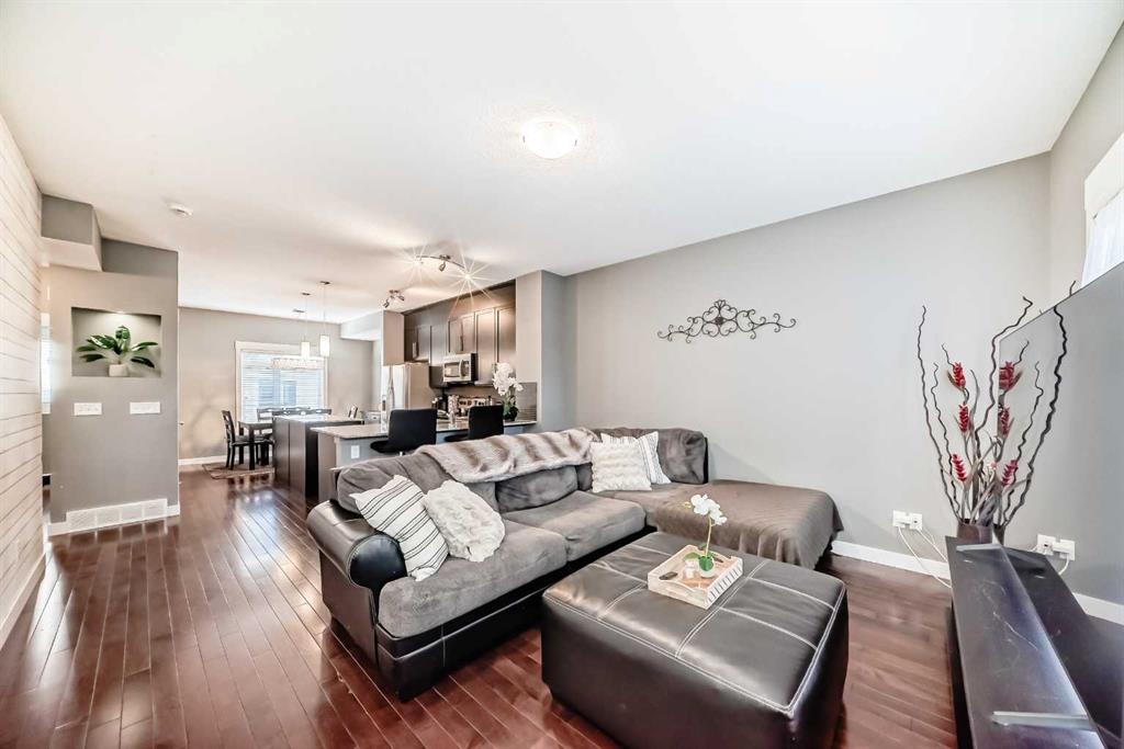 AMAZING VALUE in Skyview Ranch! This beautifully upgraded townhome offers an exceptional layout, modern finishes, and a prime location with ultimate privacy — no busy roads nearby. Enjoy peaceful courtyard views from your private patio. The lower level features a spacious tiled foyer, a versatile flex room ideal for a home office or gym, and a convenient mudroom with access to the attached DOUBLE GARAGE. The bright and open main floor boasts 9’ ceilings, rich hardwood flooring, and abundant natural light. T...