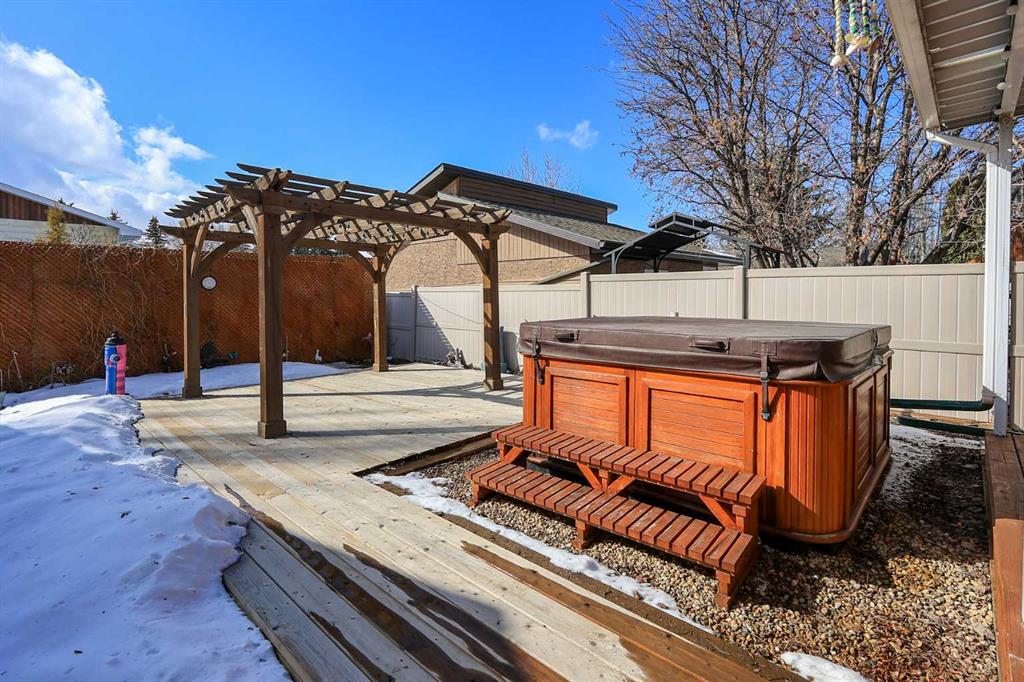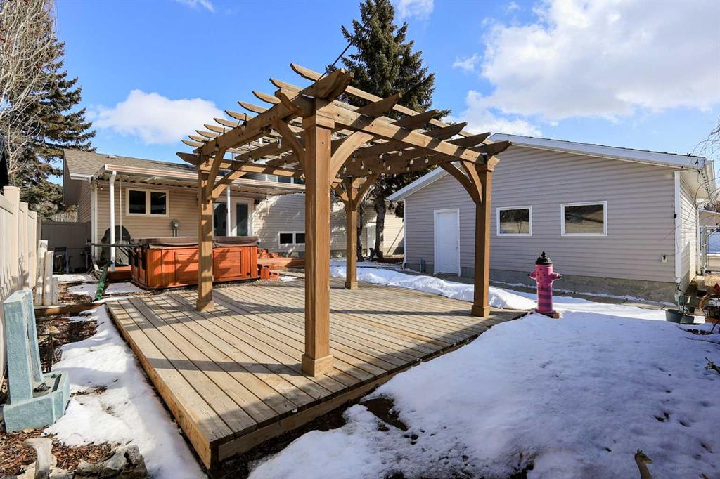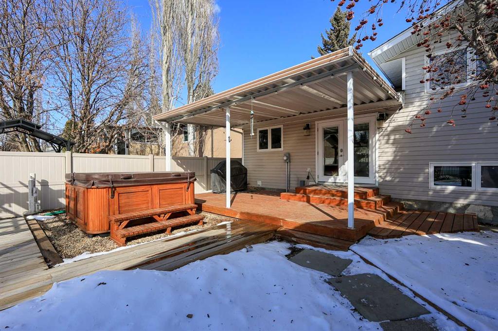 IMMEDIATE POSSESSION AVAILABLE ~ FULLY DEVELOPED 4 BEDROOM + DEN, 3 BATHROOM 4-LEVEL SPLIT ~ 2 DOUBLE GARAGES + GATED RV PARKING ~ HOT TUB ~ Large front yard with mature landscaping, huge front deck and facing a treed green space ~ The open concept main living space is filled with natural light from the large picture window that overlooks the front yard ~ The eat in kitchen offers an abundance of cabinet space, ample counter space, window above the sink, large island with an eating bar on all sides, plus ga...