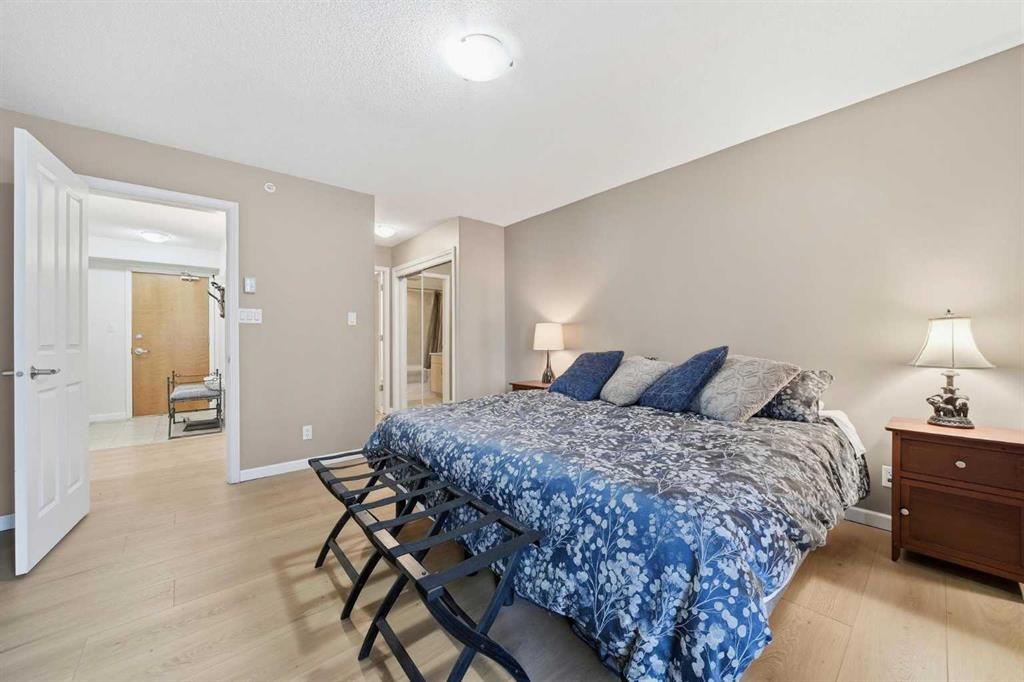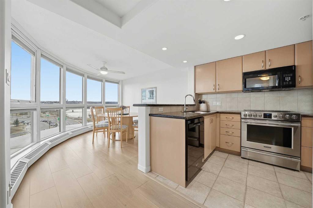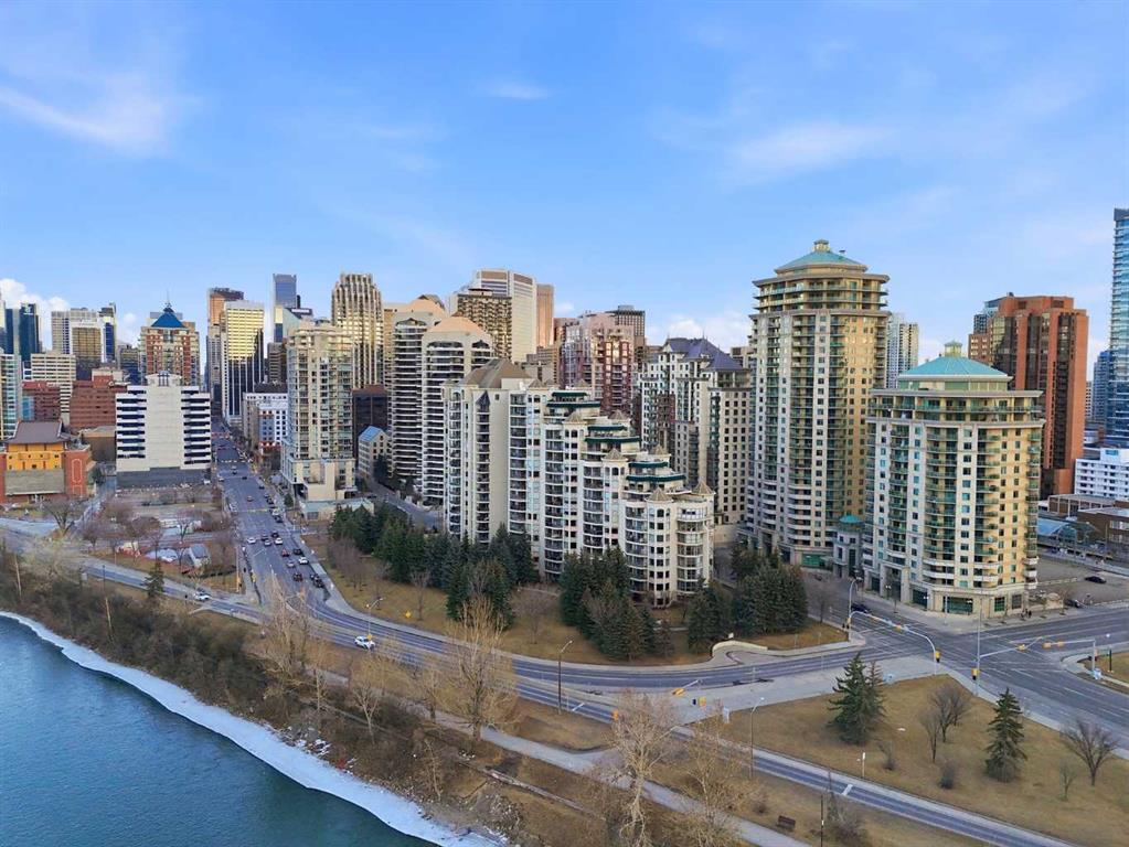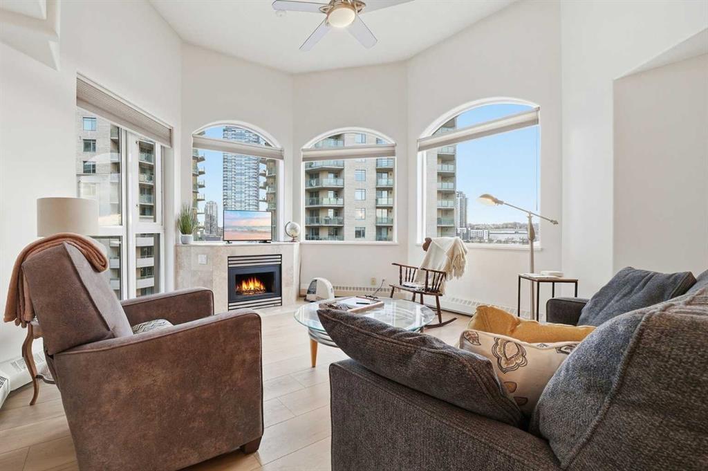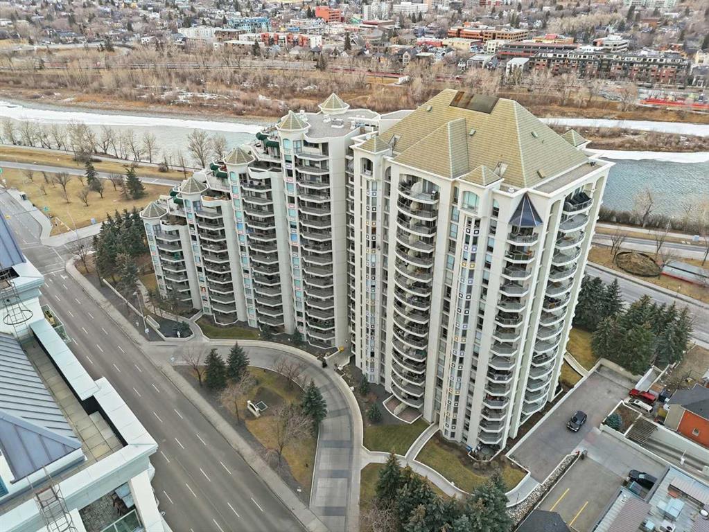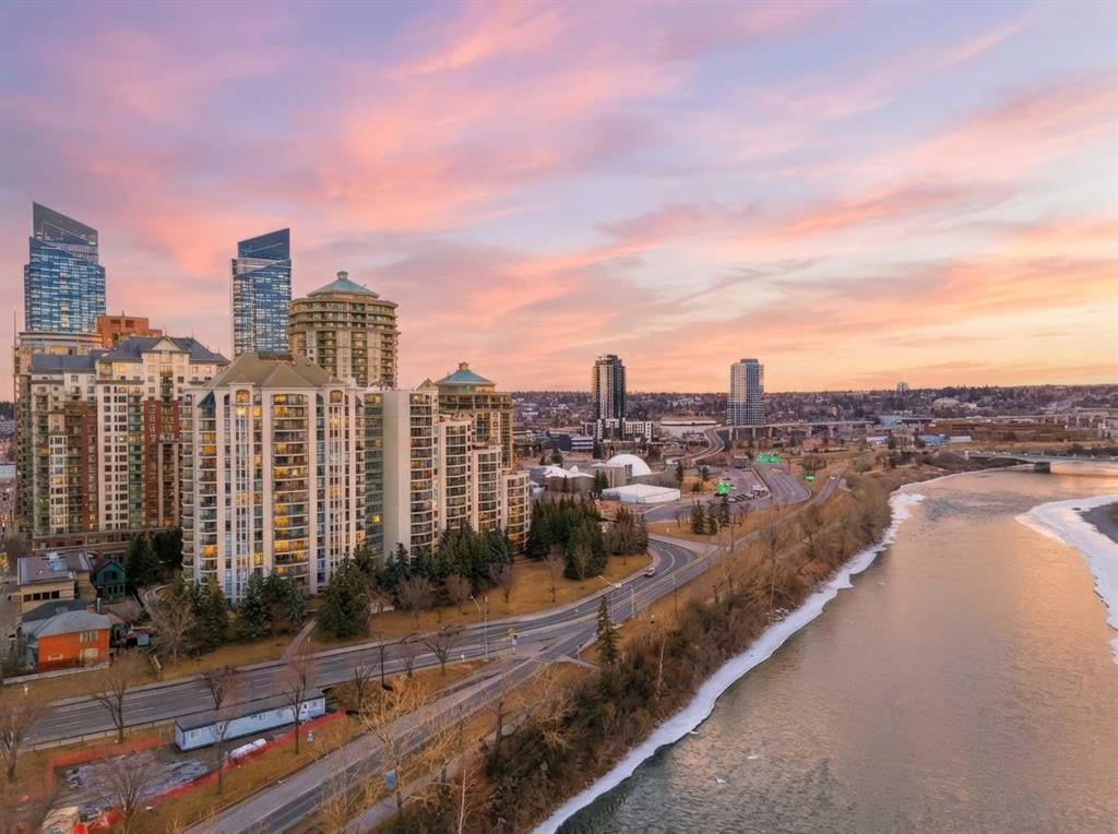 Enjoy living in a rare top-floor unit with rare VAULTED ceilings and WEST views next to the Bow River at The Marquis. This 2-bedroom, 2-bathroom unit includes TWO underground side-by-side parking stalls and is located on the southwest corner with a large south-facing balcony and oversized windows throughout. With over 1,200 sq ft of living space, this floorplan is one of the few top-floor units with 13-ft ceilings and no one above. The kitchen features granite countertops, ample storage, and open views to t...